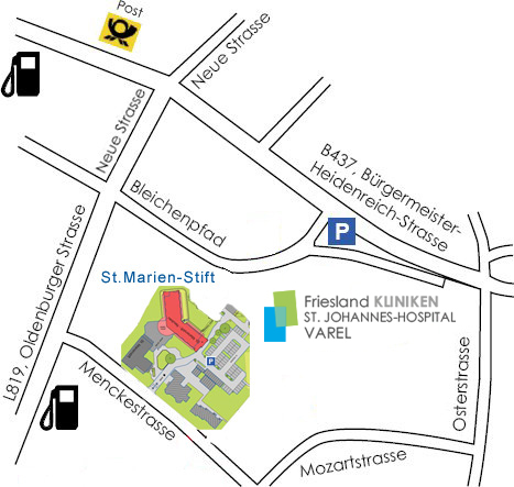 - Von der Autobahnabfahrt Varel-Obenstrohe kommend biegen Sie hinter der Esso-Tankstelle rechts von der Oldenburger Straße in die Menckestraße, nach ca. 150 m wieder links in die Auffahrt zu den Parkplätzen und zum St. Marien-Stift