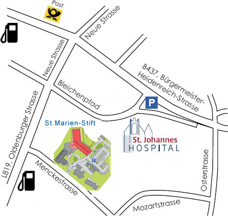 - Aus der Wesermarsch (B437) kommend biegen Sie an der Ampelkreuzung Bürgermeister-Heidenreich-Straße / Neue Straße links in die Neue Straße, fahren gerade aus über die folgende Kreuzung (Bleichenpfad / Teichgartenstraße) und biegen an der nächsten Kreuzung links in die Menckestraße, nach ca. 150 m wieder links in die Auffahrt zu den Parkplätzen und zum St. Marien-Stift